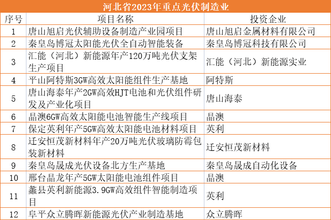 1月18日,河北省發(fā)改委發(fā)布了2023年省級重點建設(shè)項目名單,項目共計507項,總投資1.32萬億元,年度預(yù)計投資2600.1億元。其中涉及光伏項目為22項,10個為光伏電站項目,12個為光伏制造業(yè)。