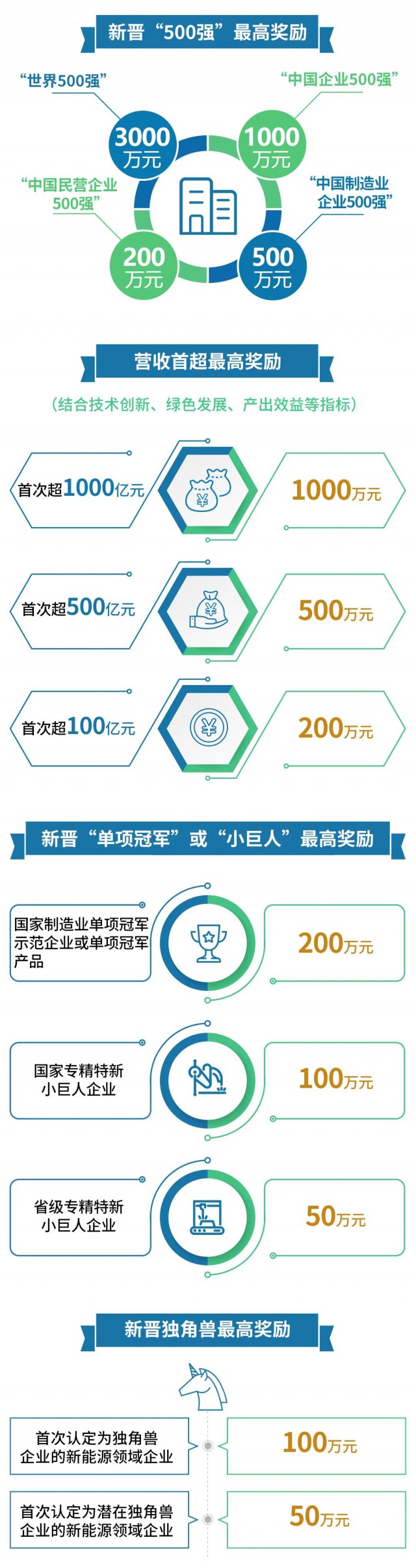 ① 先進制造業(yè)、總部經(jīng)濟等項目:按新注冊設立的獨立法人企業(yè)投產(chǎn)1年內地方貢獻總額的3%獎勵,單個項目最高獎勵500萬元;分期建設的,按一期地方貢獻獎勵。