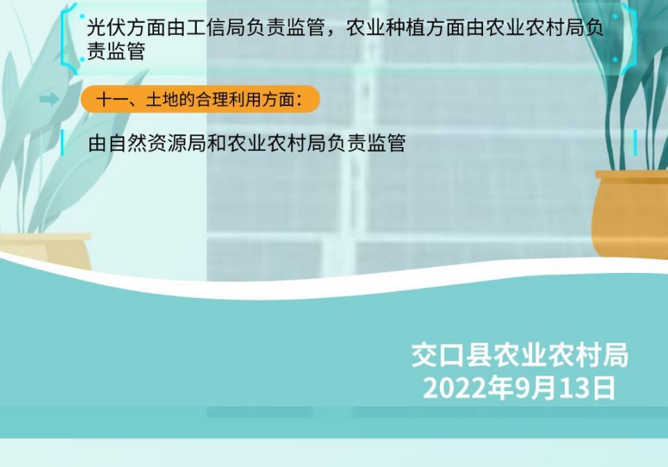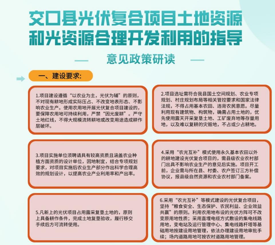 1月28日,山西省呂梁市交口縣人民政府印發(fā)《交口縣光伏復合項目土地資源和光資源合理開發(fā)利用的指導性意見》,意見要求:項目建設遵循“以農(nóng)業(yè)為主,光伏為輔”的原則,不對現(xiàn)有耕地形成實際壓占、不改變地表形態(tài)、不影響農(nóng)業(yè)生產(chǎn)。使用農(nóng)用地開展光伏復合項目建設的,要保障農(nóng)用地可持續(xù)利用,嚴禁“因光廢耕”。嚴守土地紅線,不得大規(guī)模流轉耕地或改變用途造成耕作層破壞。項目選址需符合我縣國土空間規(guī)劃、農(nóng)業(yè)專項規(guī)劃、村莊規(guī)劃布局等相關管控要求和國家法律法規(guī),不得占用基本農(nóng)田、違背農(nóng)民意愿。盡量利用現(xiàn)有建筑物、構筑物,確需占用土地的,優(yōu)先使用露天開采復墾土地、工礦廢棄地等存量用地,以及難以復耕的災毀地,不占或少占耕地。