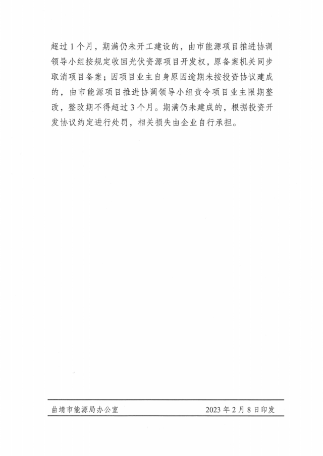 2月8日,曲靖市能源局關(guān)于印發(fā)曲靖市新能源發(fā)電項(xiàng)目實(shí)施方案的通知。通知顯示,為切實(shí)加快新能源發(fā)電項(xiàng)目推進(jìn),盡快完成并網(wǎng)發(fā)電、發(fā)揮效益,曲靖市全力推進(jìn)全市總裝機(jī)976.1萬千瓦、總投資523.53億元的75個(gè)在建風(fēng)電、光伏項(xiàng)目建設(shè),確保2023年完成并網(wǎng)350萬千瓦,完成投資100億元。