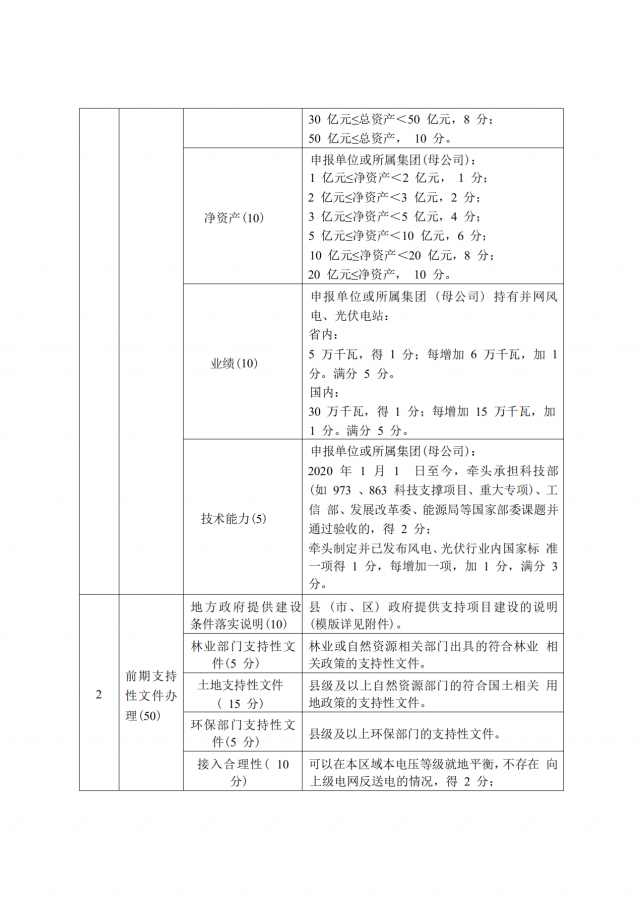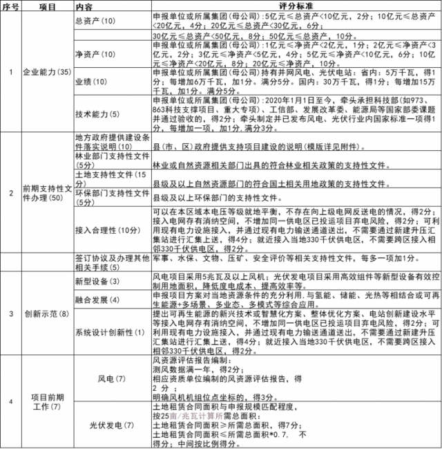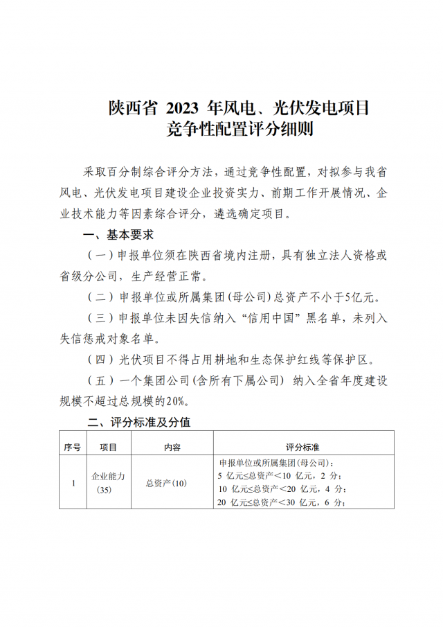 在光伏、風電競爭性配置評分細則上,要求申報單位須在陜西省境內(nèi)注冊,具有獨立法人資格或省級分公司,生產(chǎn)經(jīng)營正常。申報單位或所屬集團(母公司)總資產(chǎn)不小于5億元。另外,一個集團公司(含所有下屬公司)納入全省年度建設規(guī)模不超過總規(guī)模的20%。具體評分細則如下: