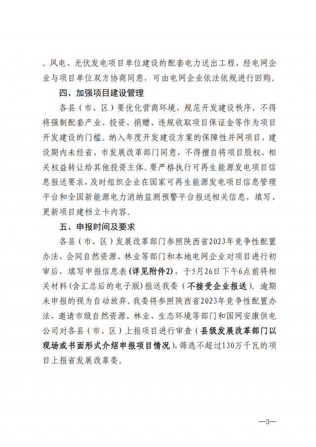 對于此次項目推進方面,陜西省要求納入2023年度新增保障性并網(wǎng)規(guī)模的光伏發(fā)電項目應于2024年12月底前全容量建成并網(wǎng)、風電項目應于2025年12月底前全容量建成并網(wǎng)。