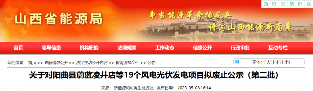 為加快推進(jìn)新能源“十四五”規(guī)劃建設(shè)進(jìn)度,實(shí)現(xiàn)我省新能源產(chǎn)業(yè)高質(zhì)量發(fā)展,我局組織各市能源局對(duì)2021年及之前項(xiàng)目單位投資不積極、確定無法建設(shè)的風(fēng)電光伏發(fā)電項(xiàng)目進(jìn)行了梳理。相關(guān)地市上報(bào)擬廢止項(xiàng)目清單,經(jīng)我局匯總,擬將陽曲縣蔚藍(lán)凌井店等19個(gè)總規(guī)模100.8萬千瓦風(fēng)電光伏發(fā)電項(xiàng)目予以廢止,現(xiàn)予公示。相關(guān)企業(yè)如有異議,請(qǐng)向相關(guān)市能源局提出書面意見,并在公示期(5個(gè)工作日)內(nèi),由市能源局上報(bào)省能源局。
