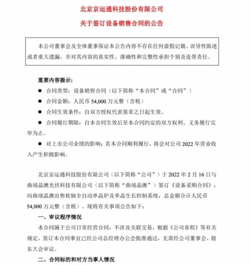 2月17日,京運通(601908.SH)公告稱,公司于2022年2月16日與曲靖晶澳簽訂《設(shè)備采購合同》,向曲靖晶澳出售軟軸全自動單晶爐及單晶生長控制系統(tǒng),總金額合計5.4億元(含稅)。
