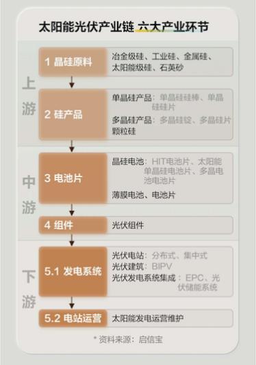 目前,我國(guó)太陽能光伏產(chǎn)業(yè)已經(jīng)形成比較完整的產(chǎn)業(yè)鏈結(jié)構(gòu),主要分為晶體硅與薄膜電池兩大類,產(chǎn)業(yè)鏈劃分為晶硅原料、硅產(chǎn)品、電池片、組件、發(fā)電系統(tǒng)、電站運(yùn)營(yíng)等6個(gè)環(huán)節(jié)。上游為晶硅原料、硅產(chǎn)品環(huán)節(jié);中游為電池片、組件環(huán)節(jié);下游為應(yīng)用系統(tǒng)等環(huán)節(jié)。