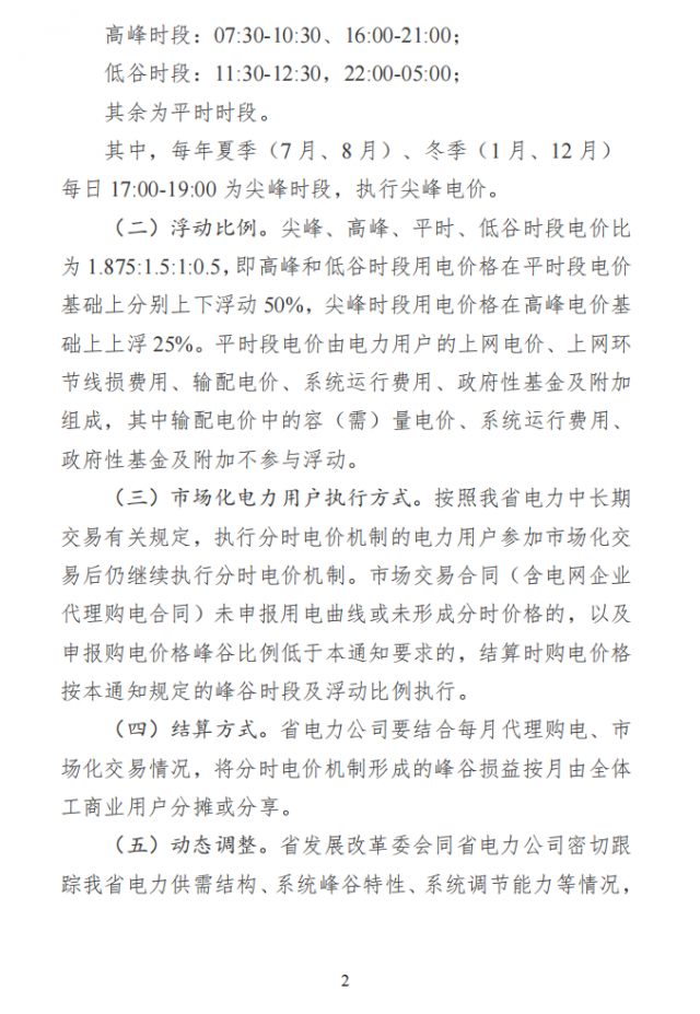 高峰時(shí)段:07:30-10:30、16:00-21:00;低谷時(shí)段:11:30-12:30,22:00-05:00;其余為平時(shí)時(shí)段。其中,每年夏季(7月、8月)、冬季(1月、12月)每日17:00-19:00為尖峰時(shí)段,執(zhí)行尖峰電價(jià)。