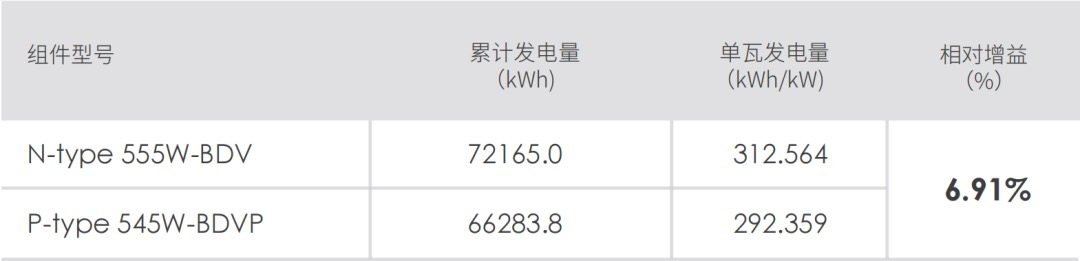在2023年5月18日-7月19日兩個月測試期間,該電站中的N型TOPCon組件有更好的發(fā)電表現(xiàn)。相比于P型PERC組件的單瓦發(fā)電量為292.359kWh/kW,N型組件的單瓦發(fā)電量為312.564kWh/kW,平均增益高達(dá)6.91%。
