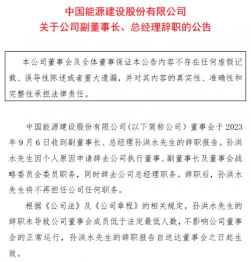 2023年9月6日,中國能建公告,公司董事會于2023年9月6日收到副董事長、總經(jīng)理孫洪水的辭職報告。孫洪水因個人原因申請辭去公司執(zhí)行董事、副董事長及董事會戰(zhàn)略委員會委員職務,同時辭去公司總經(jīng)理職務。辭職后,孫洪水將不再擔任公司任何職務。