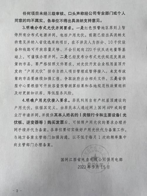 日前,國網(wǎng)江西省下發(fā)《關(guān)于進(jìn)一步明確分布式光伏消納和并網(wǎng)服務(wù)有關(guān)事項的通知》,明確要求紅色預(yù)警地區(qū)暫停戶用光伏并網(wǎng),企業(yè)租用屋頂開發(fā)的戶用光伏按非自然人管理或暫停接入,任何項目未經(jīng)三級審核均不得出具消納意見。