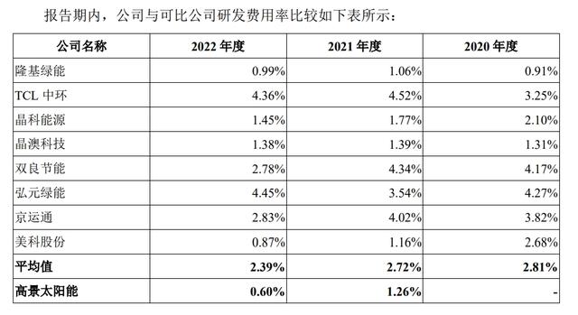 但高景太陽(yáng)能與同行相比,研發(fā)投入占營(yíng)收比例較低。招股書(shū)數(shù)據(jù)顯示,2020年,高景太陽(yáng)能未發(fā)生研發(fā)費(fèi)用。2021-2022年,高景太陽(yáng)能研發(fā)費(fèi)用分別約3143.15萬(wàn)元、1.06億元,占當(dāng)期營(yíng)收比重僅為1.26%和0.6%。作為光伏產(chǎn)業(yè)鏈企業(yè),研發(fā)費(fèi)用過(guò)低或?qū)⒂绊懝竞罄m(xù)經(jīng)營(yíng)潛力。