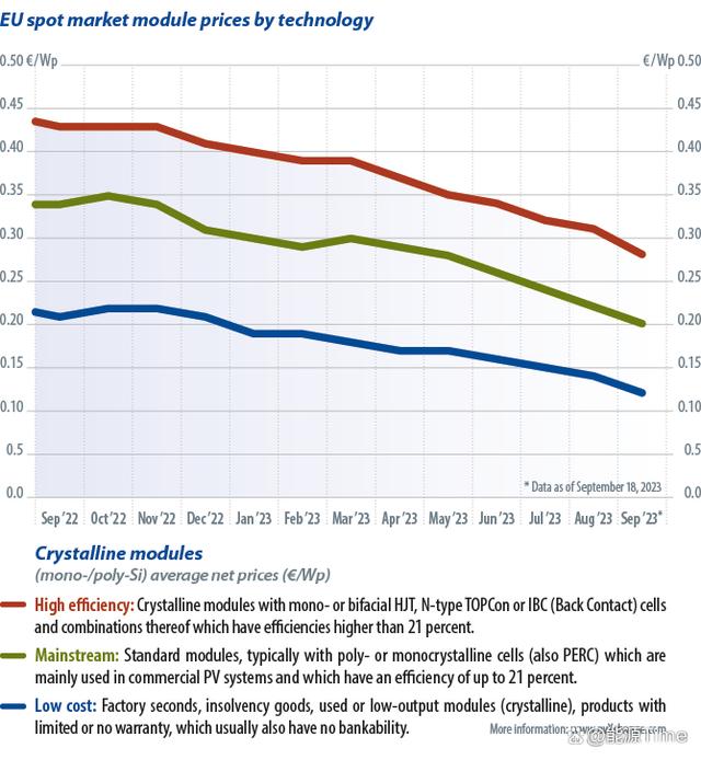 值得注意的是,歐洲的光伏組件高庫(kù)存導(dǎo)致的降價(jià)也有大量PERC組件面臨淘汰的問(wèn)題。根據(jù)《PV Magazine》的說(shuō)法,目前的庫(kù)存中有大量比例的PERC組件。在N型技術(shù)越來(lái)越普及、價(jià)格越來(lái)越低的情況下,PERC組件的銷售也遭遇了很大的困難。因此降低價(jià)格是一種意料之內(nèi)的清庫(kù)存方式。