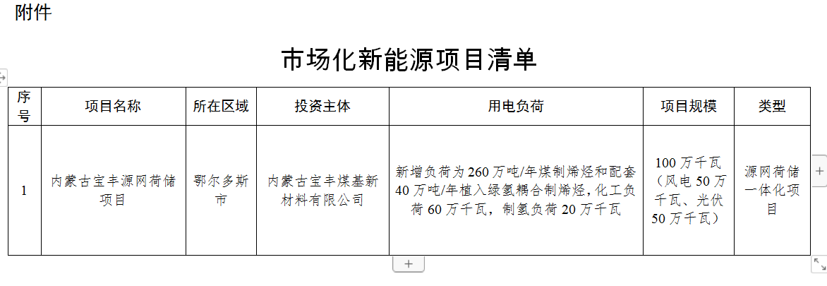 內(nèi)蒙古寶豐源網(wǎng)荷儲(chǔ)一體化項(xiàng)目,新增負(fù)荷為260萬噸/年煤制烯烴和配套40萬噸/年植入綠氫耦合制烯烴,化工負(fù)荷60萬千瓦,制氫負(fù)荷20萬千瓦,新能源建設(shè)規(guī)模為100萬千瓦(其中,風(fēng)電50萬千瓦、光伏50萬千瓦),儲(chǔ)能規(guī)模為20萬千瓦/60萬千瓦時(shí)。