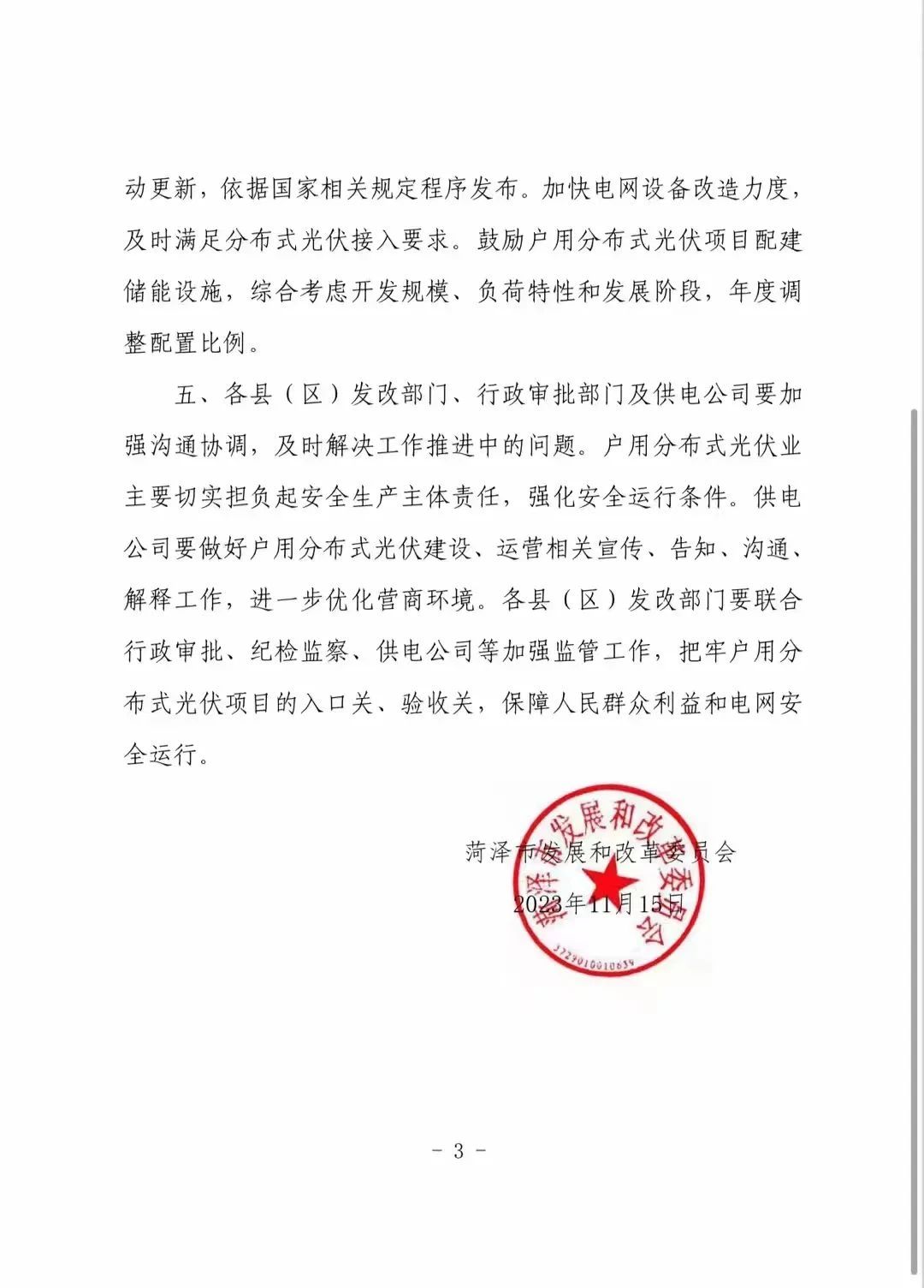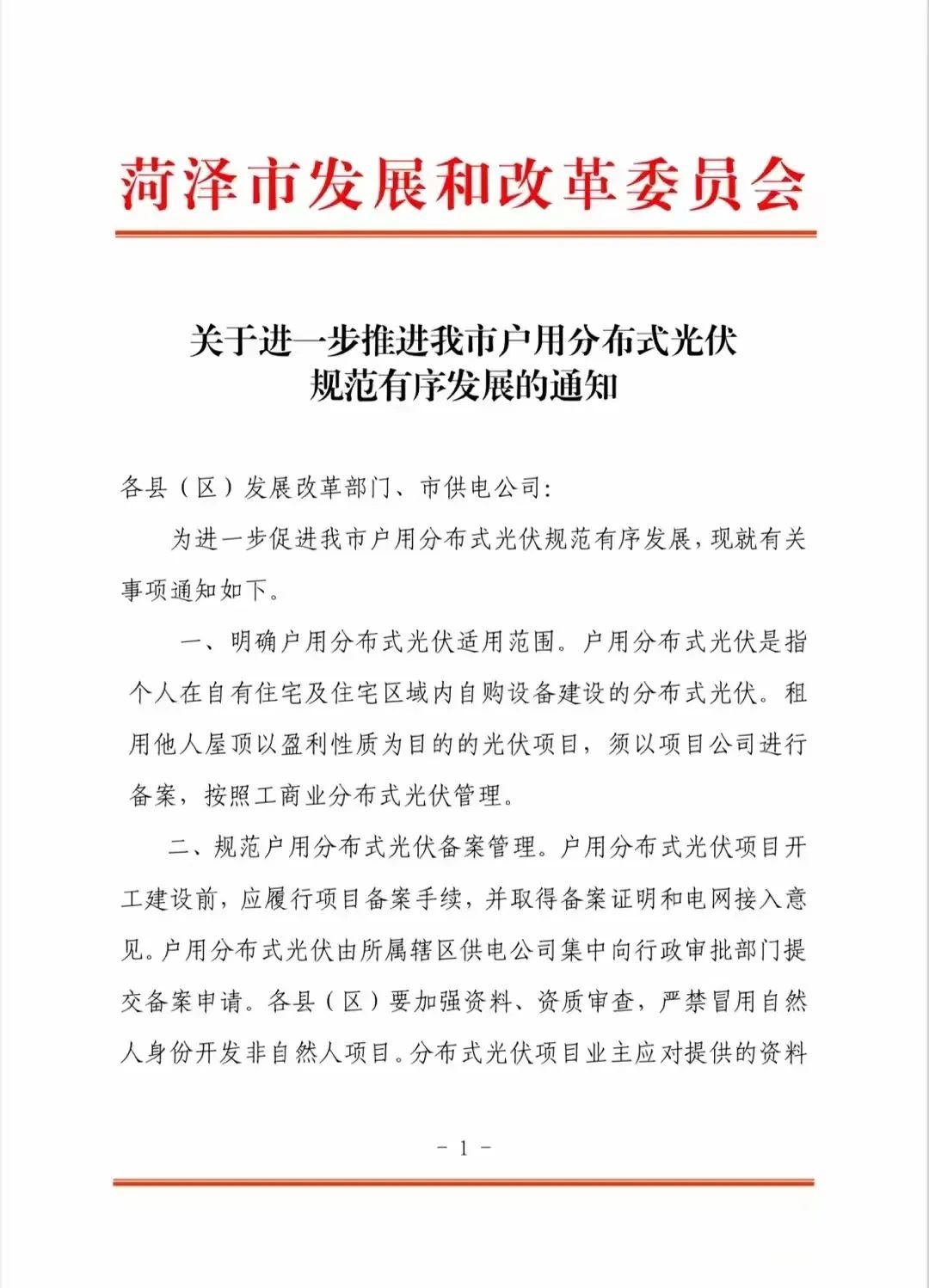 山東菏澤市發(fā)展和改革委員會下《發(fā)關(guān)于進(jìn)一步推進(jìn)我市戶用分布式光伏規(guī)范有序發(fā)展的通知》。