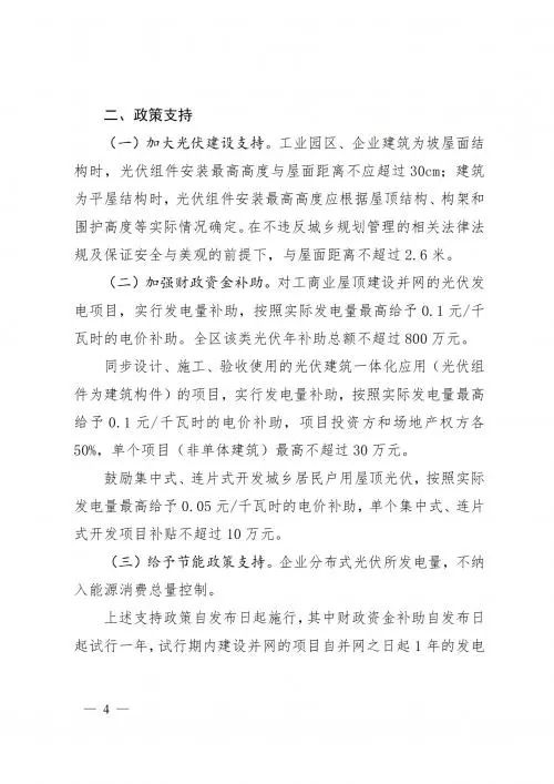 政策方面,文件指出,對(duì)工商業(yè)屋頂建設(shè)并網(wǎng)的光伏發(fā)電項(xiàng)目,實(shí)行發(fā)電量補(bǔ)助,按照實(shí)際發(fā)電量最高給予0.1元/千瓦時(shí)的電價(jià)補(bǔ)助。全區(qū)該類光伏年補(bǔ)助總額不超過800萬元。同步設(shè)計(jì)、施工、驗(yàn)收使用的光伏建筑一體化應(yīng)用(光伏組件為建筑構(gòu)件)的項(xiàng)目,實(shí)行發(fā)電量補(bǔ)助,按照實(shí)際發(fā)電量最高給予0.1元/千瓦時(shí)的電價(jià)補(bǔ)助,項(xiàng)目投資方和場地產(chǎn)權(quán)方各50%,單個(gè)項(xiàng)目(非單體建筑)最高不超過30萬元。鼓勵(lì)集中式、連片式開發(fā)城鄉(xiāng)居民戶用屋頂光伏,按照實(shí)際發(fā)電量最高給予0.05元/千瓦時(shí)的電價(jià)補(bǔ)助,單個(gè)集中式、連片式開發(fā)項(xiàng)目補(bǔ)貼不超過10萬元。