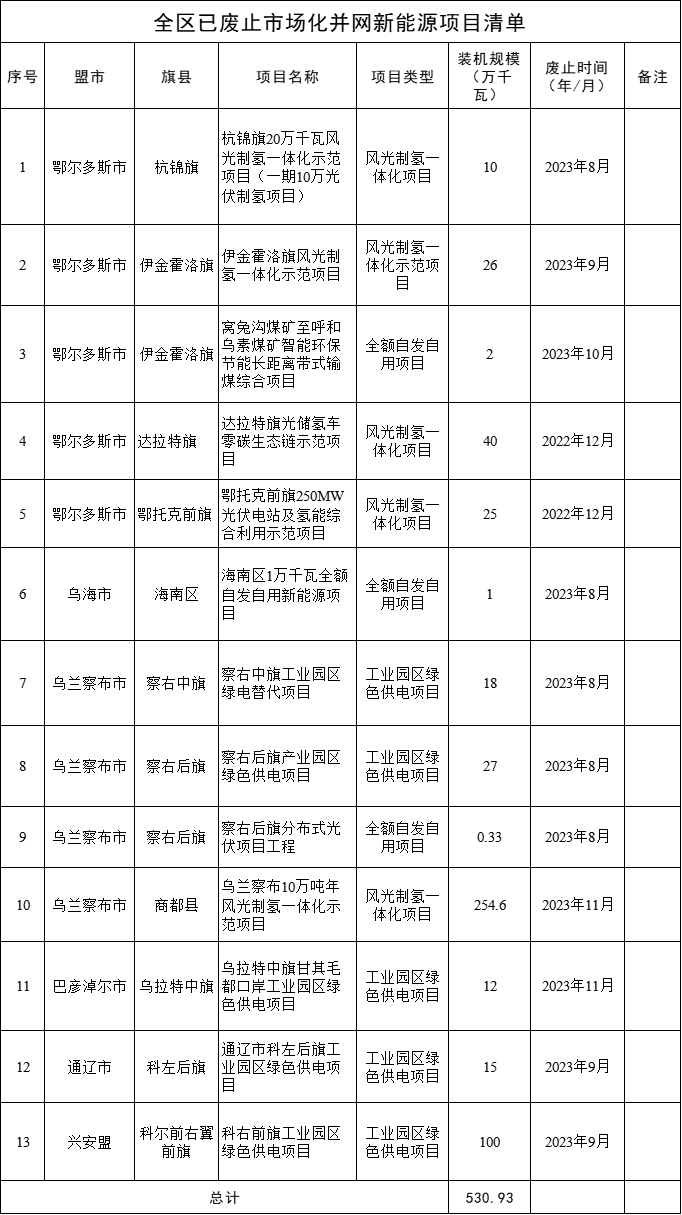 12月4日,內(nèi)蒙古自治區(qū)能源局對(duì)各盟市已廢止的市場(chǎng)化并網(wǎng)新能源項(xiàng)目進(jìn)行了公告,合計(jì)13個(gè)項(xiàng)目,涉及裝機(jī)規(guī)模超530萬千瓦,項(xiàng)目清單如下:
