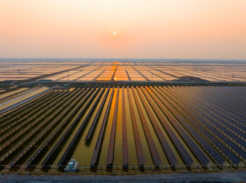 走進濰坊濱海風光儲智慧能源示范基地,波光粼粼的鹽池水面上,一排排光伏板、一座座逆變器機組整齊排列,與蔚藍的天空交相輝映,宛若一片盛放在廣袤鹽田上的光伏“藍?!保陉柟獾挠痴障蚂陟谏x,勾勒出一派科技創(chuàng)新與生態(tài)環(huán)境相得益彰的生態(tài)畫卷。
