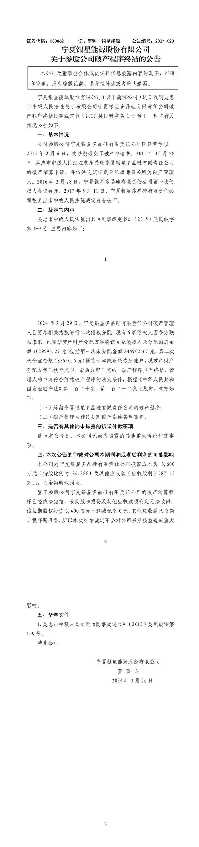 公司參股公司寧夏銀星多晶硅有限責任公司因經(jīng)營虧損,2015年2月6日,向法院遞交了破產(chǎn)申請書。2015年10月28日,吳忠市中級人民法院裁定受理寧夏銀星多晶硅有限責任公司的破產(chǎn)清算申請,并依法選定寧夏天紀律師事務(wù)所為破產(chǎn)管理人。2016年2月28日,寧夏銀星多晶硅有限責任公司第一次債權(quán)人會議召開。2017年5月11日,寧夏銀星多晶硅有限責任公司被吳忠市中級人民法院裁定宣告破產(chǎn)。2024年2月29日,吳忠市中級人民法院裁定如下:終結(jié)寧夏銀星多晶硅有限責任公司的破產(chǎn)程序,破產(chǎn)管理人繼續(xù)處理破產(chǎn)案件善后事宜。