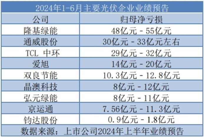 2024年上半年,光伏行業(yè)再次陷入深度困境,多家頭部企業(yè)發(fā)布的業(yè)績(jī)預(yù)告顯示,行業(yè)整體虧損嚴(yán)重,龍頭企業(yè)如隆基綠能、通威股份、TCL中環(huán)等均未能幸免。