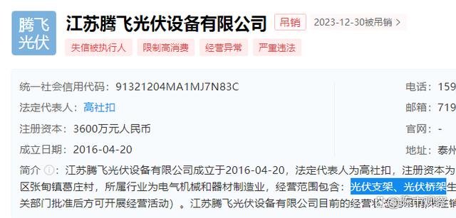 公開資料顯示,江蘇騰飛光伏設(shè)備有限公司于2016年注冊(cè)成立,距今已有8年時(shí)間。騰飛光伏主營(yíng)業(yè)務(wù)為生產(chǎn)光伏組件,其中包括光伏支架、光伏橋架等產(chǎn)品的生產(chǎn)和銷售。有接近騰飛光伏的知情人士表示,騰飛光伏并非名不見經(jīng)傳的小工廠,而是曾位列全球出貨量前十的光伏組件工廠,2022年,騰飛光伏年產(chǎn)能高達(dá)20GW,生產(chǎn)的光伏組件熱銷歐洲、美洲、東南亞等。