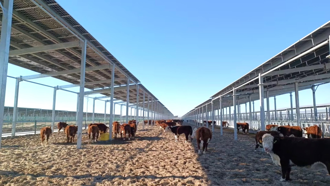 項目分三期建設(shè),一期占地9380畝,建設(shè)內(nèi)容包括育肥牛欄、動物保健中心、全混合日糧中心、升壓站及送出線路等設(shè)施。其中,育肥牛欄建設(shè)面積達150萬平方米,建成后,養(yǎng)殖規(guī)??蛇_存欄肉牛10萬頭、年出欄肉牛20萬頭,將成為亞洲最大的牧光融合產(chǎn)業(yè)集群。超級牧場內(nèi)育肥牛舍屋頂光伏及草光互補區(qū)地面光伏兩部分組成,光伏總裝機容量398兆瓦。
