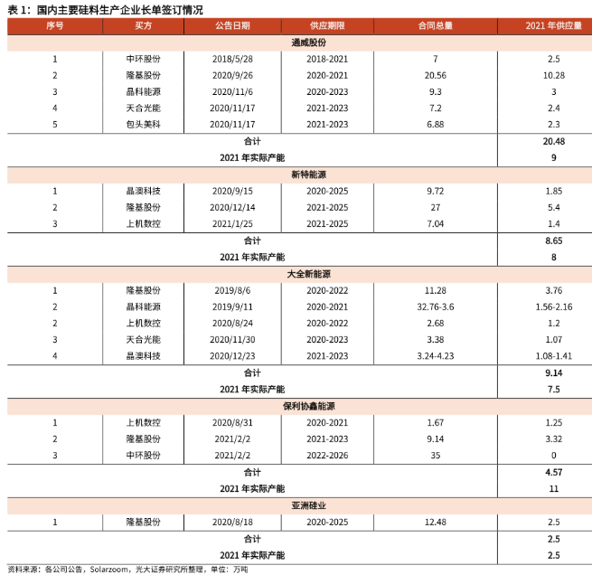在經(jīng)歷了19年的硅料產(chǎn)能釋放周期后,2020年我國硅料產(chǎn)能增量有限,且海外OCI先后關(guān)停韓國兩家多晶硅工廠(總產(chǎn)能從7.9萬噸滑落至3.2萬噸),2020年國內(nèi)硅料在產(chǎn)產(chǎn)能從2019年的45.6萬噸小幅提升至48.4萬噸,全球硅料在產(chǎn)產(chǎn)能則從2019年底的62.2萬噸減少1.9萬噸至60.3萬噸。2021年,國內(nèi)的新產(chǎn)能投放大多集中在Q4,因此對全年的實際產(chǎn)能貢獻(xiàn)有限,預(yù)計2021年全球的硅料供應(yīng)量約為55萬噸,可滿足約170GW的硅片生產(chǎn)需求。與此同時,下游的硅片廠商則在高利潤留存的背景下在2019年開啟了大規(guī)模擴(kuò)產(chǎn)浪潮。2019年在上游環(huán)節(jié)價格下跌的情況下硅片價格依然堅挺,單晶硅片環(huán)節(jié)相較其他供應(yīng)鏈環(huán)節(jié)仍存在較高的利潤空間,因此各硅片企業(yè)均開啟了較為激進(jìn)的擴(kuò)張計劃,全國單晶硅片總名義產(chǎn)能從2019年的120GW擴(kuò)張至2020年的217GW。展望2021年,各大硅片龍頭及二、三線硅片企業(yè)仍維持了較大規(guī)模的產(chǎn)能擴(kuò)張節(jié)奏,2021年底的單晶硅片名義產(chǎn)能有望再創(chuàng)新高突破300GW。在2021年硅料實際貢獻(xiàn)有限、而硅片產(chǎn)能大幅擴(kuò)張的背景下,硅片廠商于2020Q3開始密集通過和上游硅料企業(yè)簽訂鎖量不鎖價的硅料供貨長協(xié)鎖定硅料供應(yīng),從而滿足自身的生產(chǎn)需求。根據(jù)我們的統(tǒng)計,2021年已有超過80%的硅料產(chǎn)能被長協(xié)合同鎖定,主流硅料生產(chǎn)廠商中僅有保利協(xié)鑫的部分硅料產(chǎn)能尚未簽訂長協(xié)合同。