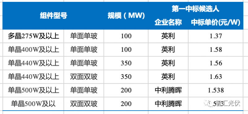 然而,根據(jù)評標(biāo)結(jié)果,實際多晶組件第一候選人價格為1.37元/W,單晶組件第一候選人價格在1.52~1.63元/W之間;因此,實際中標(biāo)價格可能遠(yuǎn)低于最高報價。