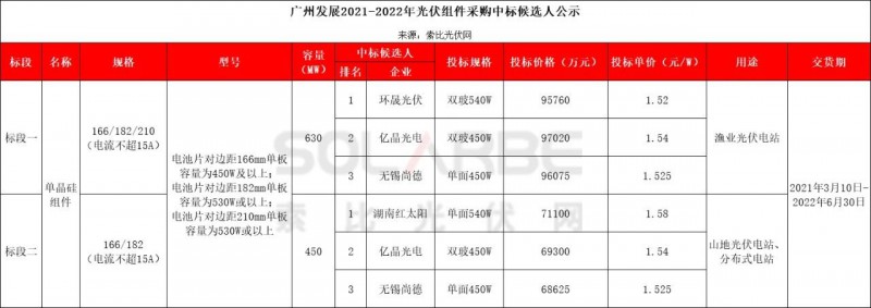 1)廣州發(fā)展1.08GW預(yù)期中標(biāo)價為1.52元/W、1.58元/W