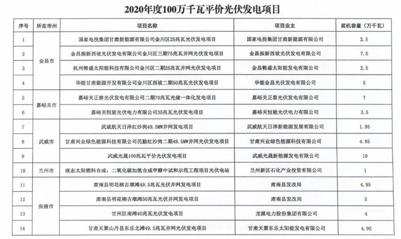 3月25日,甘肅省發(fā)改委發(fā)布《關(guān)于加快推進(jìn)全省新能源存量項(xiàng)目建設(shè)工作》的通知。文件明確,甘肅省目前新能源存量項(xiàng)目約600萬(wàn)千瓦。其中,光伏發(fā)電項(xiàng)目1.23GW包括:酒湖直流工程配套23.5萬(wàn)千瓦光伏發(fā)電項(xiàng)目以及《國(guó)家發(fā)展改革委辦公廳國(guó)家能源局綜合司關(guān)于公布2020年風(fēng)電、光伏發(fā)電平價(jià)上網(wǎng)項(xiàng)目的通知》(發(fā)改辦能源〔2020〕588號(hào))中尚未并網(wǎng)100萬(wàn)千瓦光伏發(fā)電項(xiàng)目。