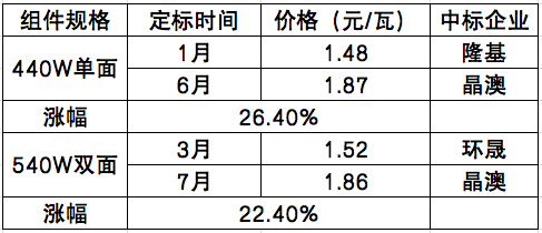 在價格方面,2021年上半年隨著組價集采的推進(jìn),組件價格受硅料上漲影響,其報價也呈現(xiàn)快速上漲的趨勢。從年初中核集團(tuán)第一批1.3GW組件集采,隆基單面450組件報出1.48/瓦元的中標(biāo)價格,到今年6月蒙能包頭50MW技術(shù)領(lǐng)跑項(xiàng)目中晶澳以450單面1.87元/瓦的中標(biāo)價格拿下上半年“標(biāo)王”,組件漲幅約26%左右。相較于去年1.55元/瓦的定標(biāo)均價而言,今年440+組件已經(jīng)來到1.7元/瓦上下;540雙面則由3月廣東電力第一批組件集采的1.52元/瓦的中標(biāo)價上漲至7月廣東電力第三批組件集采的1.86元/瓦中標(biāo)價格,漲幅約22.37%。