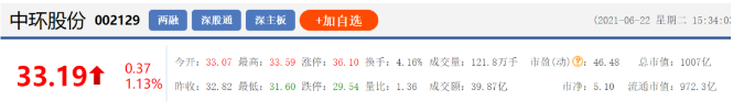 截至6月22日收盤,中環(huán)股份(002129.SZ)股價(jià)為33.19元/股,總市值達(dá)到1007億元。
