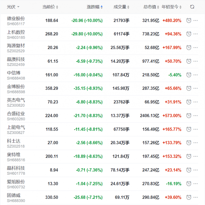 而近期掀起的又一波漲價潮,也最終反應(yīng)在資本市場。截止中午休盤時間,德業(yè)股份、上機數(shù)控主板跌停下跌10%、海源復(fù)材下跌9.96%、晶澳科技下跌9.73%、中信博下跌9.04%。