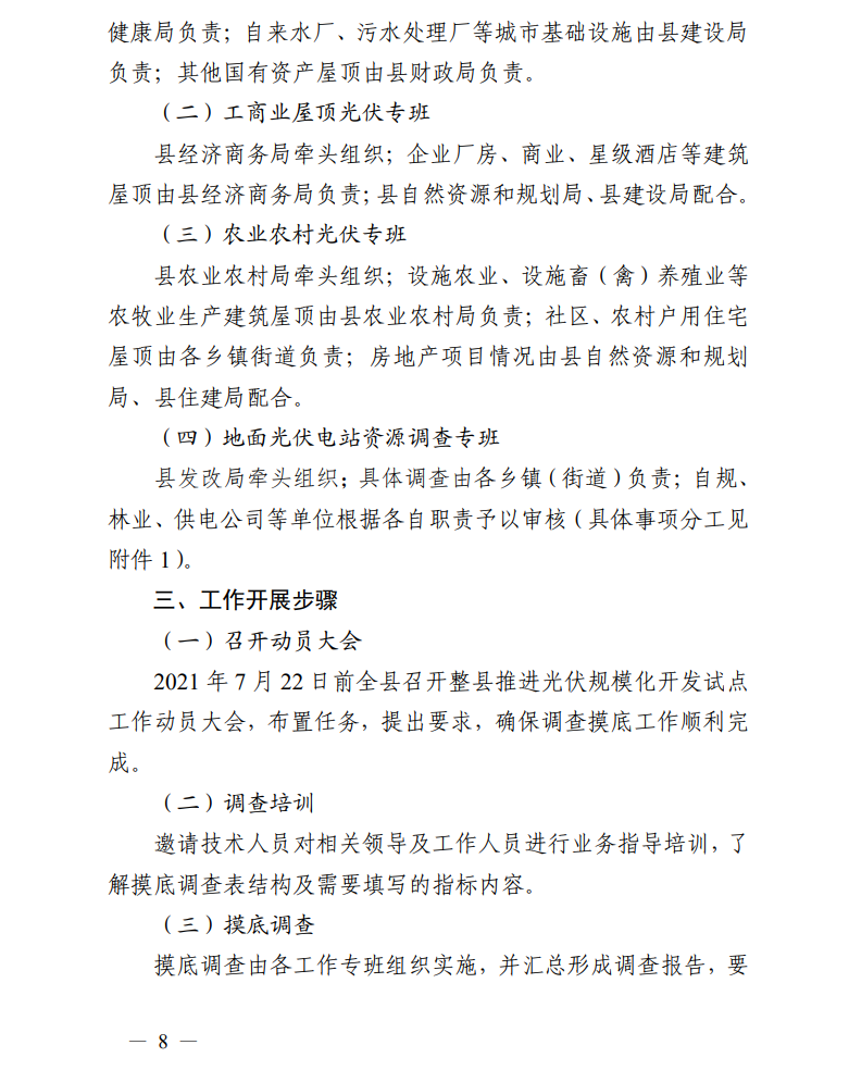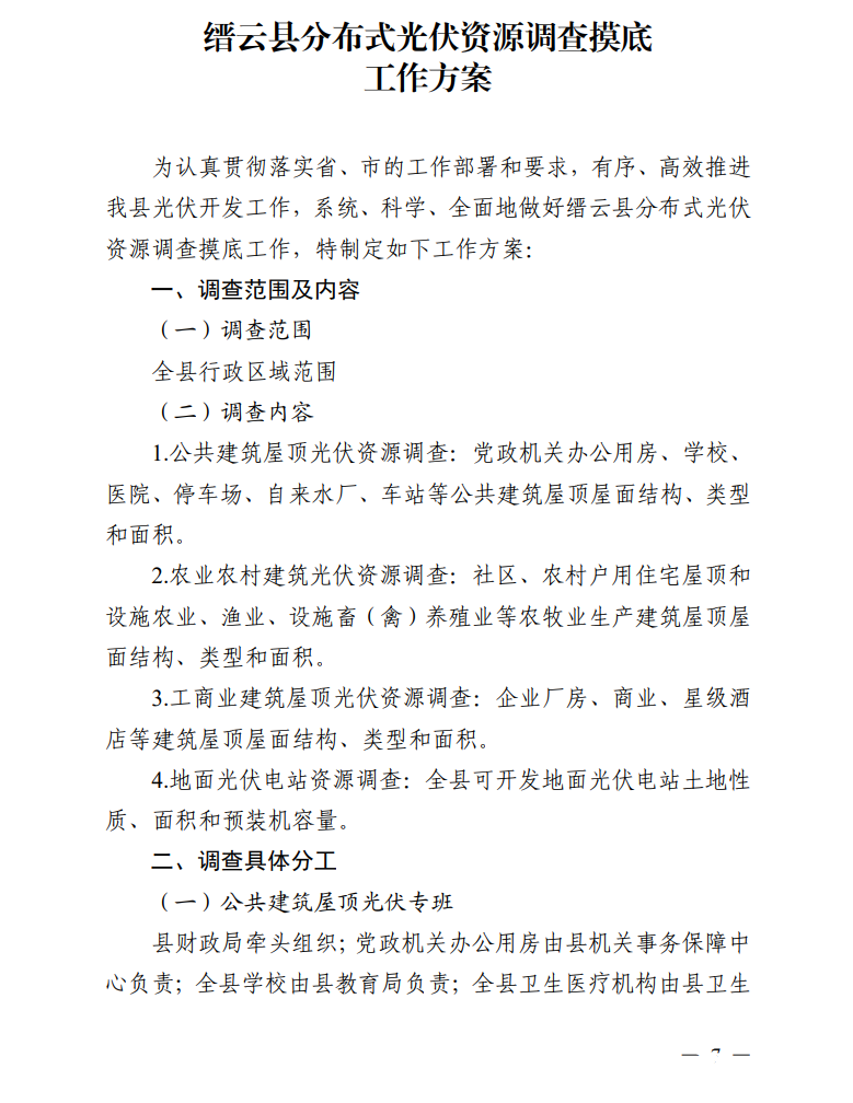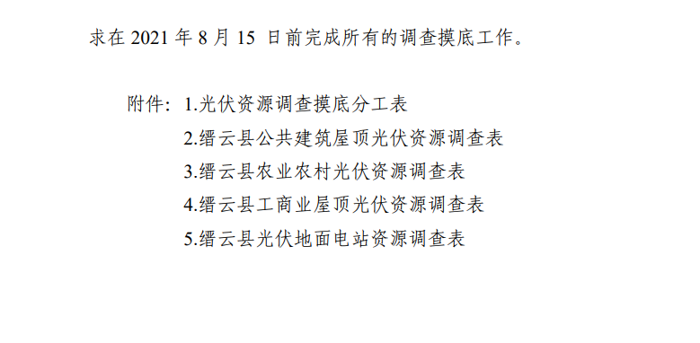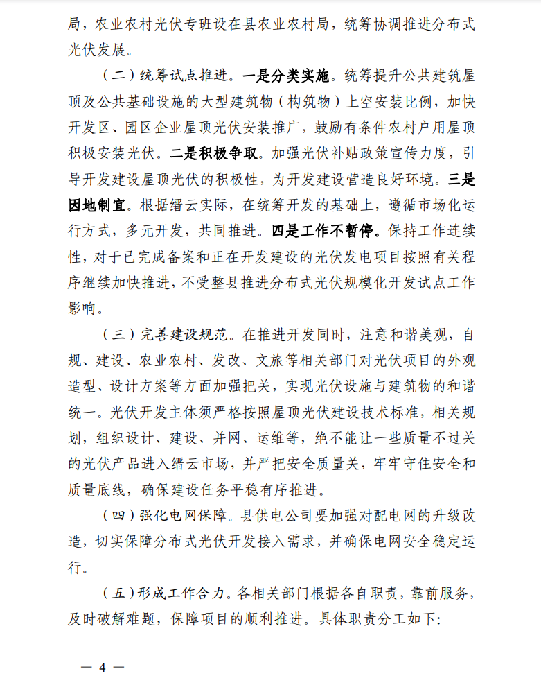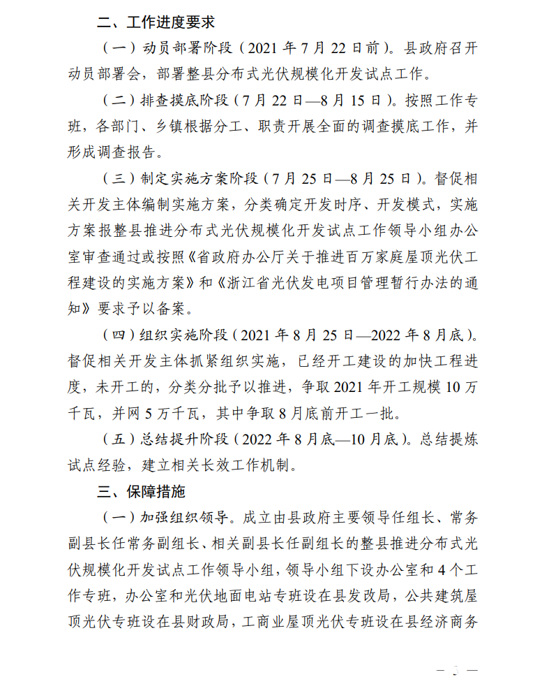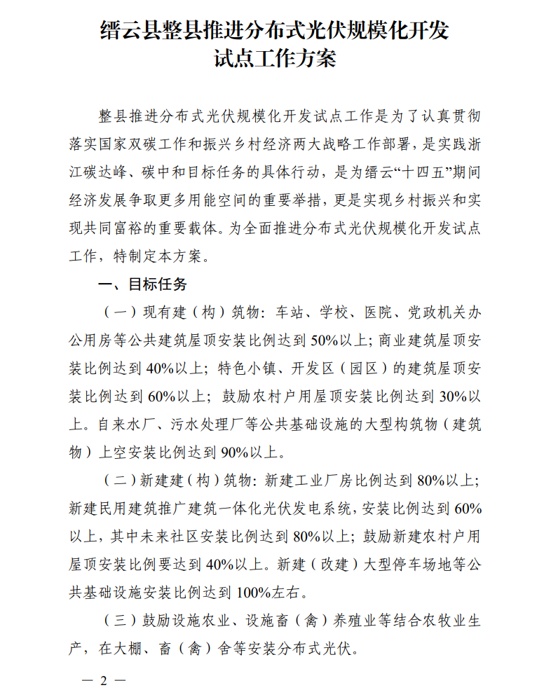 日前,縉云縣人民政府辦公室發(fā)布關(guān)于印發(fā)《縉云縣整縣推進分布式光伏規(guī)?;_發(fā)試點工作方案》《縉云縣分布式光伏資源調(diào)查摸底工作方案》的通知。通知明確,縉云縣整縣推進分布式光伏規(guī)模化開發(fā)試點工作目標任務(wù)為: