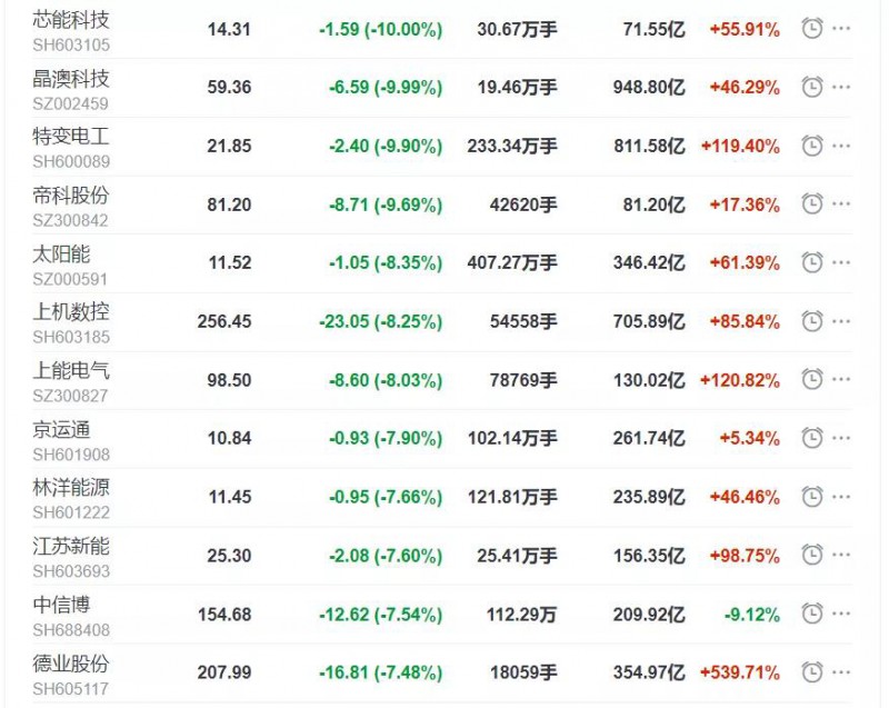 國慶假期后的第一個(gè)交易日,光伏板塊高開后一路下跌,截至收盤,光伏產(chǎn)業(yè)指數(shù)(東財(cái))下跌2.8%,50支成分股僅有14家上漲,而跌幅超過5%的個(gè)股達(dá)到15家。其中,芯能科技和晶澳科技跌停,特變電工、太陽能盤中一度封死跌停。