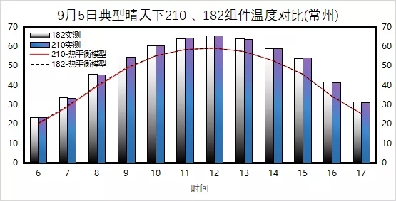 為探究組件真實(shí)戶外工作溫度,使用HIOKI熱電偶數(shù)據(jù)采集儀對組件進(jìn)行工作溫度采集。實(shí)證結(jié)果顯示,210與對比測試樣件溫度幾乎無差異,根據(jù)輻照加權(quán)平均溫度,210組件甚至略低于對比組件0.5℃。使用PVsyst仿真,組件相同溫度系數(shù)的情況下,在常州,工作溫度每降低1℃,發(fā)電量提升約為0.2%。同時,選取9月5日典型天氣,將實(shí)測數(shù)據(jù)及實(shí)測氣象數(shù)據(jù)代入穩(wěn)態(tài)熱平衡模型,更證明了高電流、低開壓的210組件無明顯溫升,且在早晚輻照及溫度較低時,210組件組件工作溫度較低。