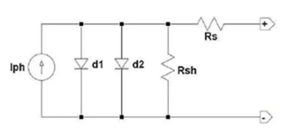 為研究210低輻照性能優(yōu)勢,本文以雙二極管模型對測試樣件進(jìn)行建模分析;二極管模型表征電池及組件特性被廣泛使用,例如PVsyst中的PAN file; 在傳統(tǒng)的單二極管模型上,雙二極管模型額外考慮了耗盡區(qū)的復(fù)合損耗,可以有效驗(yàn)證低輻照下組件性能: