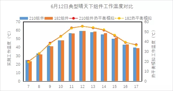 任選典型晴天下,組件工作溫度實(shí)測與模擬結(jié)果均顯示,210組件并無高工作溫度風(fēng)險(xiǎn),且早晚低輻照時段,210組件溫度略有優(yōu)勢: