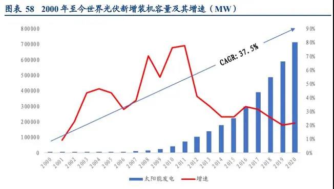 2014 年之后,光伏發(fā)電行業(yè)經(jīng)過優(yōu)勝劣汰的篩選,發(fā)電成本持續(xù)大幅下降,投資回報(bào)重 新獲得平衡,全球更多的國(guó)家加入到支持光伏發(fā)電的行列,具有技術(shù)研發(fā)優(yōu)勢(shì)、規(guī)模優(yōu)勢(shì)的企業(yè)涌現(xiàn)??v觀歷史,近20年間光伏增速年均復(fù)合增長(zhǎng)率達(dá) 37.5%。