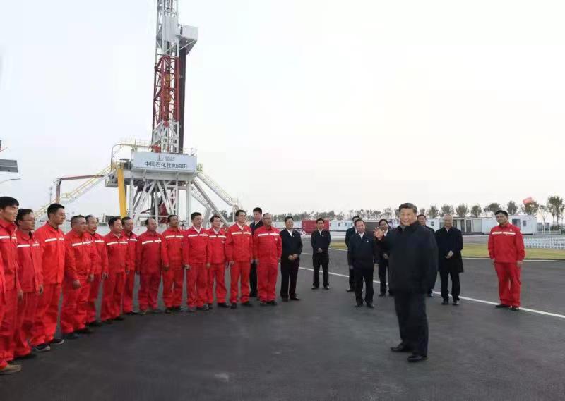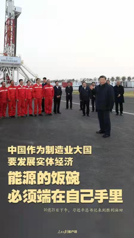 10月21日下午,習近平總書記來到勝利油田,登上鉆井平臺,察看作業(yè)情況,看望慰問石油工人。今年是勝利油田發(fā)現(xiàn)60周年。習近平代表黨中央向廣大石油職工致以誠摯問候。習近平指出,石油能源建設對我們國家意義重大,中國作為制造業(yè)大國,要發(fā)展實體經(jīng)濟,能源的飯碗必須端在自己手里。希望你們再創(chuàng)佳績、再立新功。