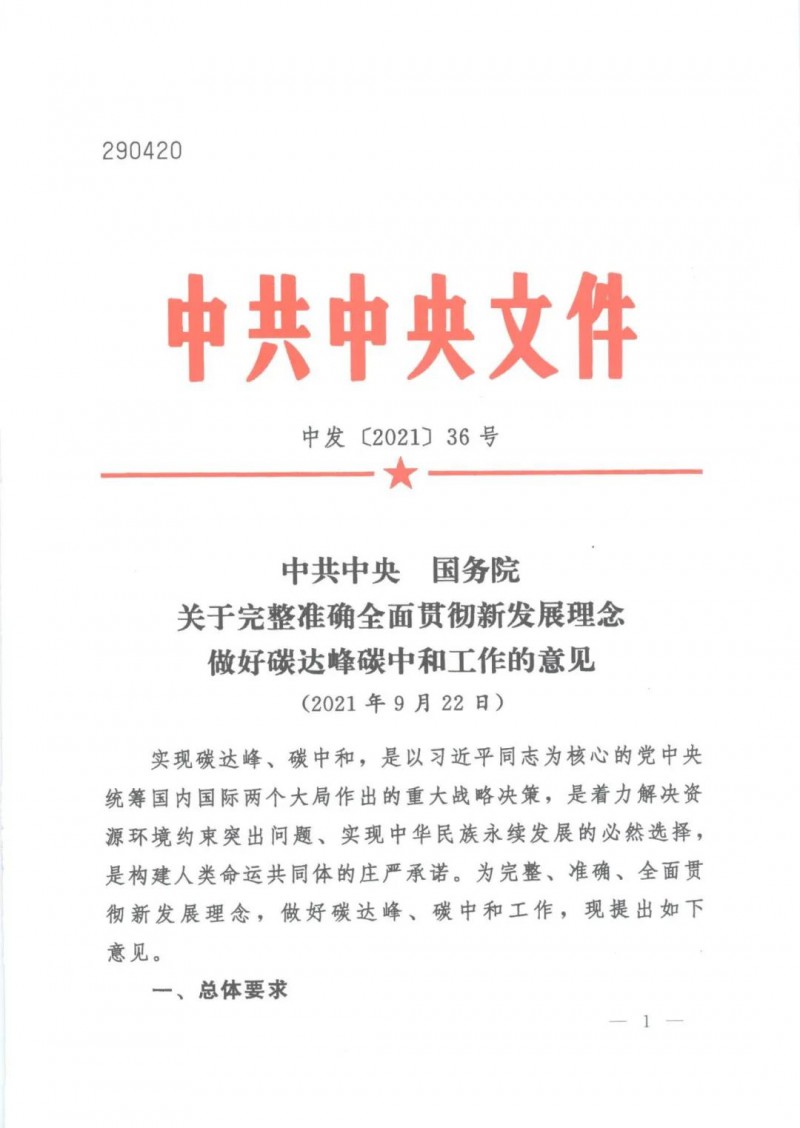 9月22日,中共中央下發(fā)《關(guān)于完整準確全面貫徹新發(fā)展理念做好碳達峰碳中和工作的意見》。