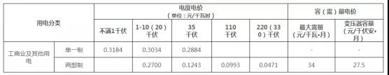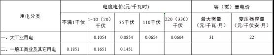 注:1.表中各電價(jià)含增值稅、線(xiàn)損、交叉補(bǔ)貼及區(qū)域電網(wǎng)容量電價(jià),不含政府性基金及附加。2.政府性基金及附加標(biāo)準(zhǔn)分別為農(nóng)網(wǎng)還貸資金2分/千瓦時(shí)、國(guó)家重大水利工程建設(shè)基金0.1125分/千瓦時(shí)、可再生能源電價(jià)附加1.9分/千瓦時(shí)、大中型水庫(kù)移民后期扶持基金0.62分/千瓦時(shí)。3.110千伏及以上“網(wǎng)對(duì)網(wǎng)”外送電省外購(gòu)電用戶(hù)承擔(dān)的送出省平均輸電價(jià)格為每千瓦時(shí)不超過(guò)0.022元(含稅、含線(xiàn)損、下同),最高不超過(guò)每千瓦時(shí)0.03元。4.變壓器容量在315千伏安及以上的一般工商業(yè)及其他用戶(hù)可選擇執(zhí)行表中大工業(yè)生產(chǎn)用電兩部制電價(jià)。