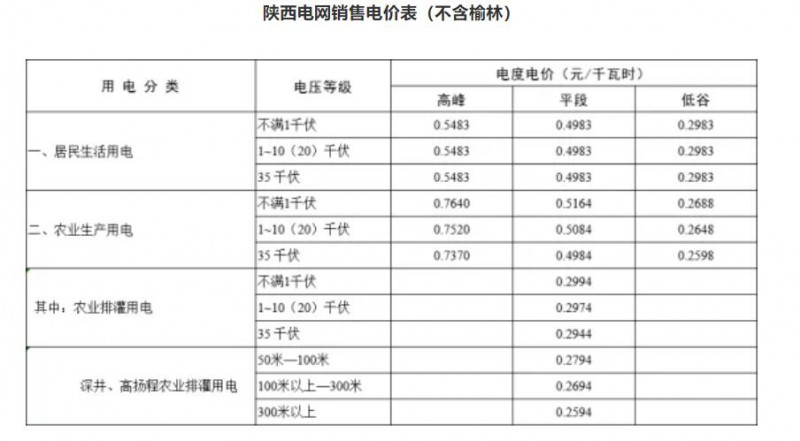榆林電網(wǎng)銷(xiāo)售電價(jià)表