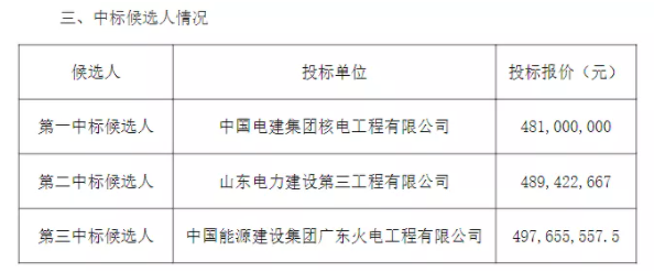 第一中標候選人:中國電建集團核電工程有限公司,投標含稅總報價∶19762.307 萬元,折合3.85元/W。