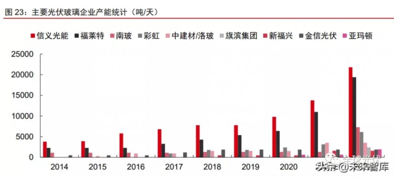 2021年光伏玻璃價(jià)格大幅回落,2022年價(jià)格或?qū)⒕S持中低位波動(dòng)。光伏玻璃供需格局的變化也反應(yīng)在企業(yè)庫(kù)存。據(jù)卓創(chuàng)資訊統(tǒng)計(jì),2021H1,隨著行業(yè)產(chǎn)能擴(kuò)張以及需求延后,光伏玻璃行業(yè)主流廠商庫(kù)存天數(shù)由年初10天以內(nèi)快速增至40天左右;受此影響,光伏玻璃價(jià)格也于4月從高點(diǎn)出現(xiàn)“腰斬式”下跌。隨著Q3后庫(kù)存逐步消化回落,以及受純堿價(jià)格大幅上漲推動(dòng),光伏玻璃價(jià)格從底部開(kāi)始有所回升,目前3.2mm產(chǎn)品價(jià)格約30元/平米,2.0mm產(chǎn)品價(jià)格約23元/平米。展望2022年,我們認(rèn)為在原材料成本有望逐步回落,且行業(yè)供需格局總體保持寬松的情況下,光伏玻璃價(jià)格有望在中低水平整體保持穩(wěn)定,預(yù)計(jì)3.2mm和2.0mm玻璃價(jià)格或?qū)⒃?5元/平米和20元/平米的中樞附件波動(dòng)。