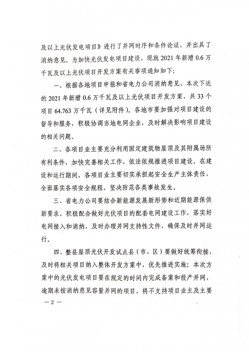 本次下達(dá)2021年新增0.6萬千瓦及以上光伏項(xiàng)目開發(fā)方案,共33個(gè)項(xiàng)目64.763萬千瓦。