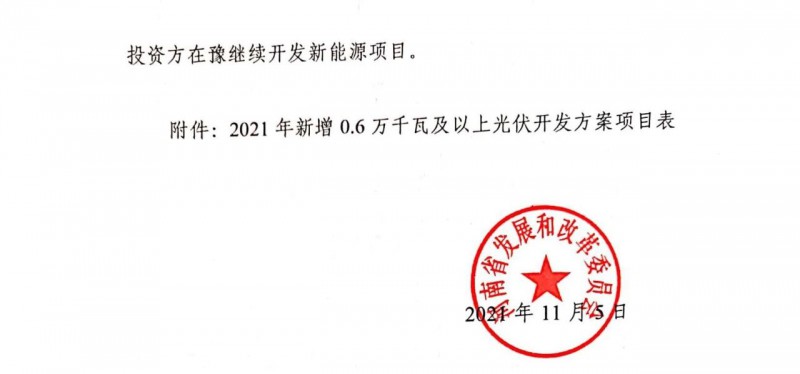 11月5日,河南省發(fā)改委下發(fā)《關(guān)于下達(dá) 2021年新增0.6萬千瓦及以上光伏項(xiàng)目開發(fā)方案的通知》。文件指出,對(duì)于不新增用地、利用固定建筑物及其附屬場(chǎng)所建設(shè)的光伏項(xiàng)目,不限申報(bào)規(guī)模!
