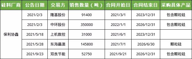 保利協(xié)鑫與下游客戶陸續(xù)簽訂采購長單:保利協(xié)鑫與隆基、中環(huán)、上機、晶澳、雙良等下游客戶簽訂硅料采購長單,總供應量68.46萬噸,年均供應量22.82萬噸;其中,隆基、中環(huán)、雙良采購產(chǎn)品中明確包含顆粒硅產(chǎn)品,晶澳將于未來5年向協(xié)鑫采購總計14.58萬噸顆粒硅;而上機則將與保利協(xié)鑫共建30萬噸顆粒硅產(chǎn)能。下游客戶長單采購表明了顆粒硅進一步獲得認可。