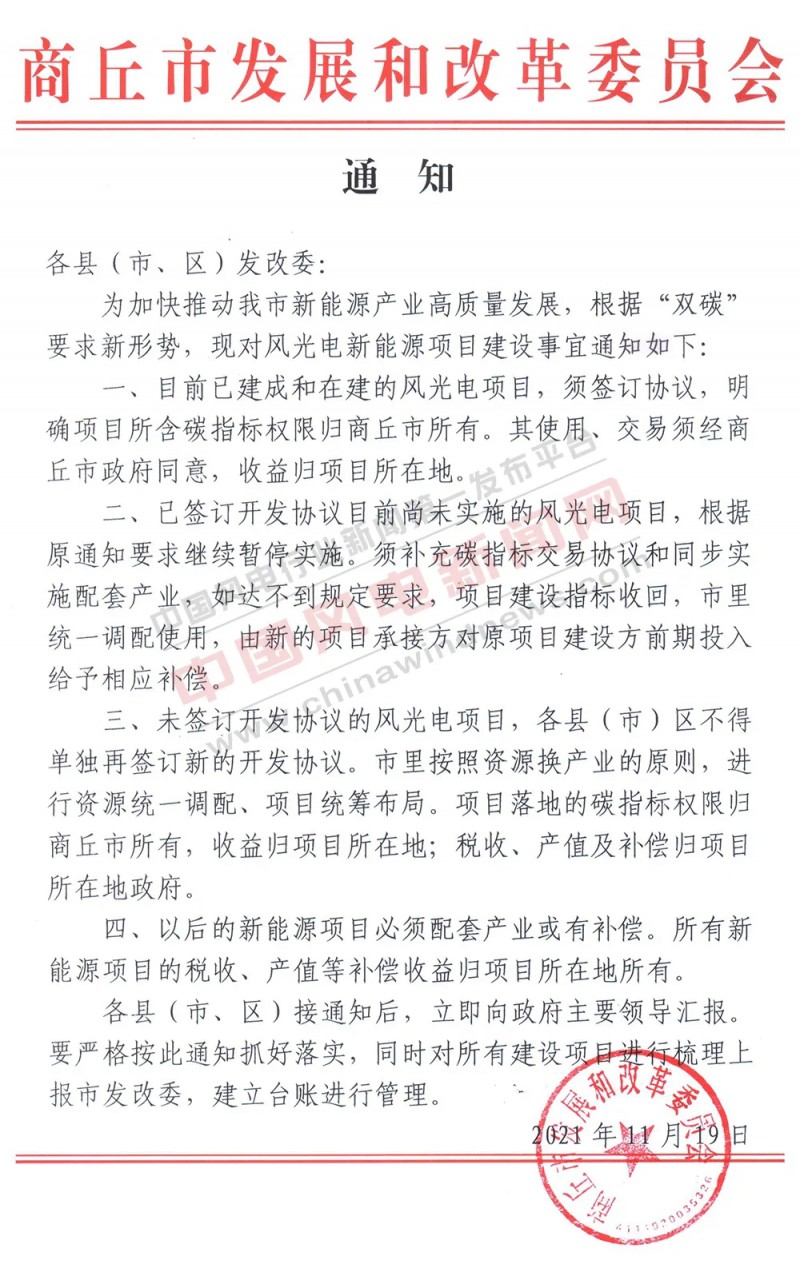 11月19日,商丘市發(fā)改委下發(fā)關(guān)于風(fēng)電光伏項(xiàng)目建設(shè)通知,通知要求: