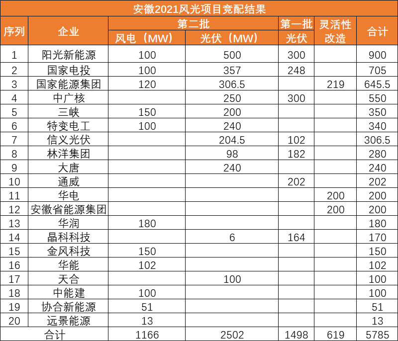 此前10月21日,安徽省能源局下發(fā)《2021年光伏發(fā)電項(xiàng)目并網(wǎng)規(guī)模競爭性配置(第一批次)中選公告》,規(guī)模共計(jì)1498MW。中廣核、陽光新能源、國家電投、通威、林洋、晶科、信義光能等7家企業(yè)中標(biāo)20個(gè)光伏第一批優(yōu)選項(xiàng)目。加上此次安徽省總共公示了4GW光伏、1.166GW風(fēng)電項(xiàng)目。