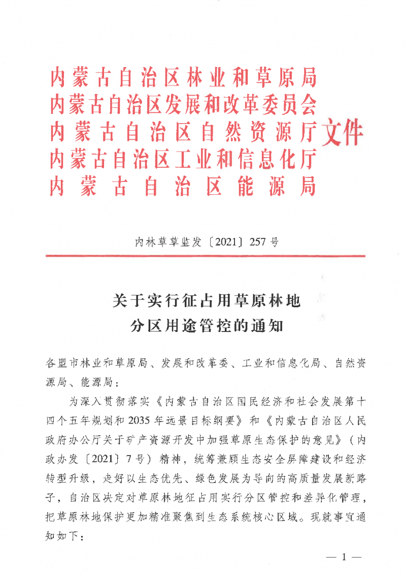 近日,內(nèi)蒙古自治區(qū)林業(yè)和草原局,內(nèi)蒙古自治區(qū)發(fā)展和改革委員會,內(nèi)蒙古自治區(qū)自然資源廳,內(nèi)蒙古自治區(qū)工業(yè)和信息化廳,內(nèi)蒙古自治區(qū)能源局聯(lián)合發(fā)布了《關(guān)于實行征占用草原林地分區(qū)用途管控的通知》,把草原林地保護(hù)更加精準(zhǔn)聚焦到生態(tài)系統(tǒng)核心區(qū)域。文件顯示,內(nèi)蒙古將實行征占用草原林地分區(qū)用途管控。
