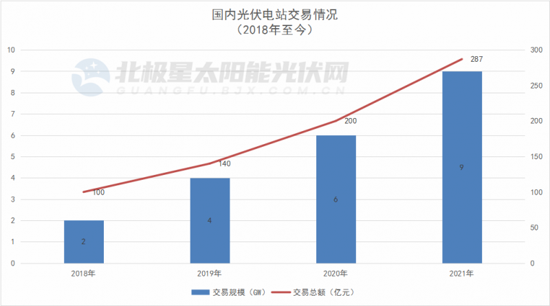 據(jù)北極星太陽(yáng)能光伏網(wǎng)數(shù)據(jù)庫(kù)顯示,2018年至今,我國(guó)光伏電站交易規(guī)模正以2GW+/年速度攀升。2018年我國(guó)光伏電站交易規(guī)模在2GW以上,交易總額超100億元;2019年電站交易規(guī)模“翻倍”達(dá)到4.24GW,交易總額140多億元;2020年可統(tǒng)計(jì)的光伏電站總交易規(guī)模攀升至6.3GW,交易總額超過(guò)200億元。2021年初至今,可統(tǒng)計(jì)的光伏電站總交易規(guī)模已超9GW,交易總額287億元以上。